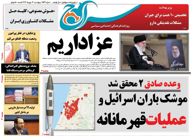 بازتاب حمله موشکی ایران به اسرائیل در ۳ نشریه فرانسوی : لیبراسیون/جنگ خاورمیانه تا کجا؟ ایران که واکنشش از زمان کشته شدن حسن نصرالله زیر ذره بین بود، روز سهشنبه، بارانی از موشکها را به سمت اسرائیل پرتاب کرد. هرگز ترس از جنگی همه جانبه در منطقه بیش از این نبوده است. لوفیگارو:اسرائیل زیر آتش موشک های ایران تهران شامگاه سهشنبه بیش از ۱۰۰ موشک به سوی دولت یهود شلیک کرد و نسبت به هرگونه واکنش اسرائیل با تشدید جنگ علیه حزبالله در لبنان هشدار داد. لومانیته/سناریو وحشتناک در خاورمیانه ایران شامگاه سه شنبه در واکنش به بمباران ارتش اسرائیل در لبنان و یمن، به اسرائیل موشک شلیک کرد. یک گام دیگر به سوی جنگ در منطقه.